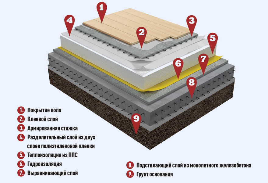 Разработан шаблон спецификации в соответствии с ГОСТ Р 21.1101-2013. Пол по грунту с теплоизоляцией из пенополистирольных плит ППС35-Р, уложенной по подстилающему слою из бетона. На теплоизоляцию укладываются разделительный слой из двух слоев полиэтиленовой пленки, армированная стяжка, клеевой слой и покрытие пола. Применяется в многоэтажном строительстве.
