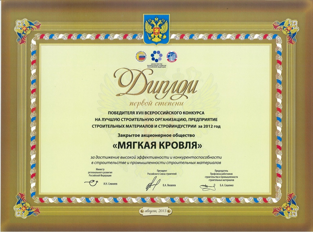 Теперь наше предприятие по производству кровельной и гидроизоляционной продукции «Мягкая кровля» занимает почётное место в рейтинге лидеров строительного комплекса России по итогам 2012 года.